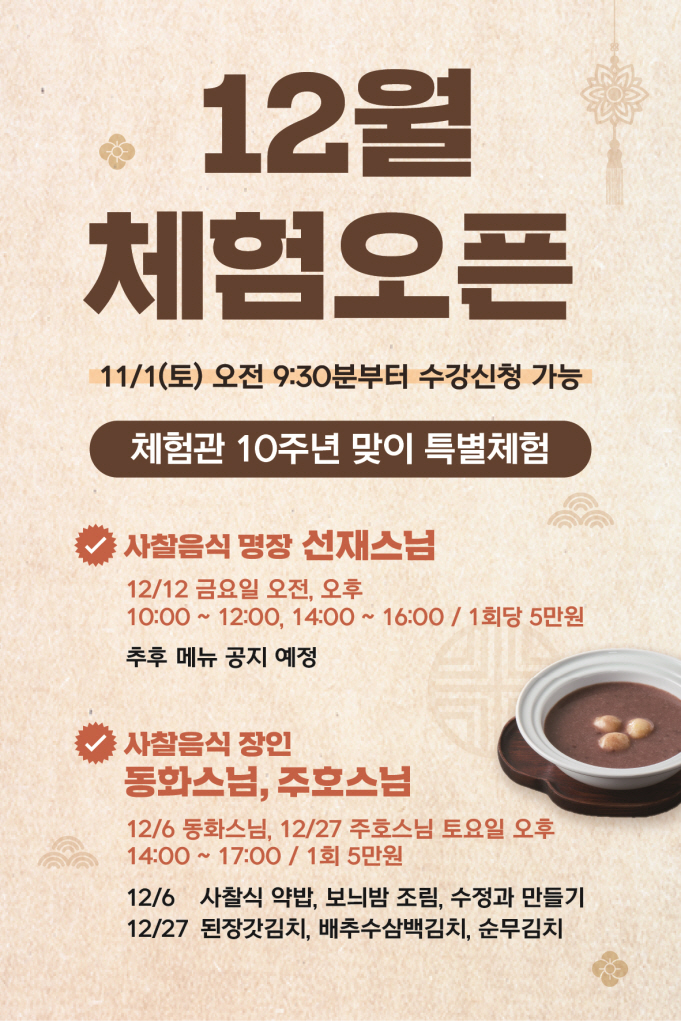 사찰음식 전문가 인력풀(Pool) 모집 대한불교조계종 한국불교문화사업단에서는 사찰음식 전문조리사 자격증을 보유한 스님 및 일반인을 대상으로 "사찰음식 전문가 인력풀(POOL)"을 모집합니다. 선발된 분들은 향후 한국불교문화사업단 및 전국 사찰에서 진행하는 사찰음식 관련 행사와 교육 등에 강사, 보조강사, 조교 등으로 참여하게 됩니다. 관심 있는 분들께서는 아래 내용을 확인하신 후, 첨부된 지원서를 작성하여 기한 내에 접수해 주시기 바랍니다. 많은 분들의 적극적인 참여를 바랍니다. □ 모집 분야 : 사찰음식 전문가 ※ 한국불교문화사업단에서 시행한 사찰음식 전문조리사 시험 합격자에 한함 ※ 스님은 사찰음식 전문강사 양성 교육을 수료하셔야 신청 가능함 □ 접수 기간 : 2025년 8월 20일(수) ~ 9월 12일(금) 접수기간 에만 서류제출 가능!!! 미리보내거나 늦을시 접수제외됨! ※ 접수기한 내 제출서류 미비(누락, 식별 불가)시 별도 추가(보충) 서류를 재요청하지 않으며 대상자 선정에서 제외 □ 지원 자격(필수) 1. 한국불교문화사업단에서 발급한 사찰음식 전문조리사 시험 합격자(스님, 일반인) ※ 스님이 신청하실 경우 첨부파일 1, 2를 같이 제출하셔야 합니다. ※ 일반인들은 첨부파일 1을 제출하시되, 작성해야 하는 경력이 많은 경우 칸을 추가하여 작성해주시기 바랍니다. 2. 요리 관련(조리사, 강사 등) 7년 이상 재직(증빙 서류 제출) / 일반인 ※ 증빙서류 - 4대 보험 납입이 확인이 또는 기관(구청이나 학교 등) 경력증명서 발급이 되는 경력만 인정. 단, 사찰에서 근무한 경우 사찰 주지스님 직인이 있는 경우 가능 / 일반인 - 경력 증빙 시 일주일에 최소 3회이상(하루 3시간 이상) 강의한 경우에만 인정됨 3. 사찰음식 전문강사 양성 교육 수료자 / 스님 □ 수행 역할 : 2026년 이후 전국 템플스테이 및 사찰음식 특화사찰, 홍보행사 사찰, 외부 기관에서 사찰음식 프로그램 운영 및 보조 예정 □ 사업 내용 1. 사찰음식 자격증 취득자 대상 사찰음식 전문인력풀 구성 2. 사찰음식(한국불교문화사업단) 홈페이지를(예정) 통해 인력풀(개인 정보 제외) 공유 □ 제출 서류 1. 신청서(개인정보 이용 동의서 포함) 1부 2. 경력증명서 및 해당 분야 자격증 사본 등 전문인력 증빙자료(한글 파일에 첨부) □ 선발 방법 : 서류 심사 1. 서류심사 결과 통보 : 2025년 10월 24일(금) 13:00 이후 개별 통보 □ 신청 방법 : 사찰음식 홈페이지(https://www.koreatemplefood.com) 에서 신청서를 다운 받아 이메일 접수(csy0109@templestay.com) ※ 개별 방문 접수는 받지 않음 ※ 반드시 한글파일로 접수해야 함 ※ 사진 또는 pdf, 자필로 작성한 파일을 제출한 경우 심사대상에서 제외 됨 ※ 작성칸이 부족할 경우 칸을 추가하여 작성 ※ 증빙서류는 한글 파일 뒤에 첨부해야 하며, 개별 제출 금지 ※ 제출 양식에 맞지 않으면 서류 접수 되지 않음 □ 제외대상 ※ 타 기관 사찰음식 자격증 소지자 ※ 사찰음식 교육 수료자 □ 접수된 서류는 반환하지 않음 □ 제출된 서류 등에 허위 기재 또는 기재 착오, 구비 서류 미제출 등으로 인한 불이익은 제출자 본인에게 있음 □ 문의처 : 한국불교문화사업단 사찰음식팀(☎ 02-2031-2051)