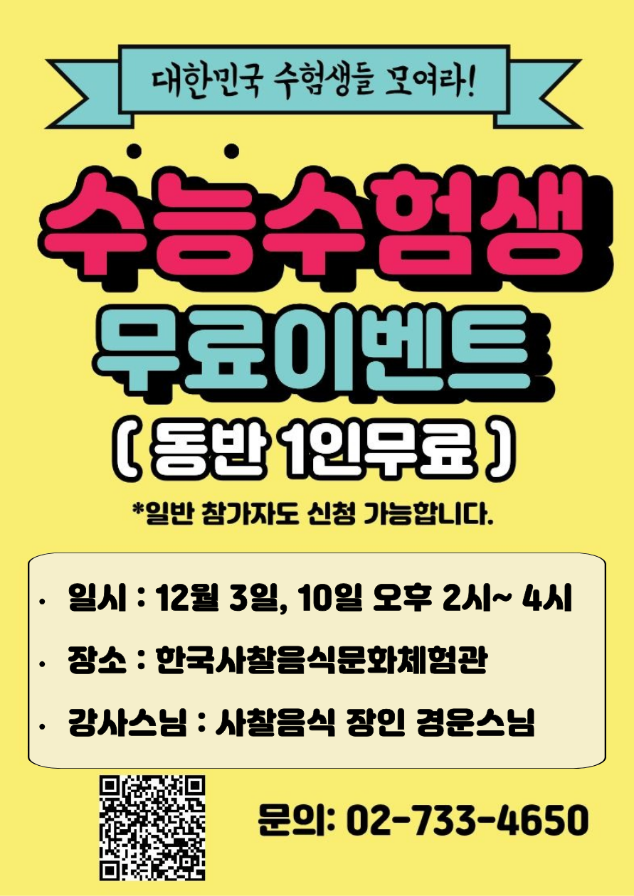 2025 사찰음식 전문조리사 보수 교육 합격자 발표 2025 사찰음식 전문조리사 보수 교육 합격자를 다음과 같이 발표합니다. 합격하신분들에게는 개별 문자를 보내드렸습니다. 동명이인이 많아 이름(전화번호 끝자리) 으로 확인부탁드립니다. 올해 교육에 참석하지못하신 분들은 내년에도 교육이 진행될 예정이오니 많은 관심 부탁드립니다. 감사합니다. 김지영(3653) 황정아(1771) 이다원(3210) 김혜경(6805) 김현주(62...